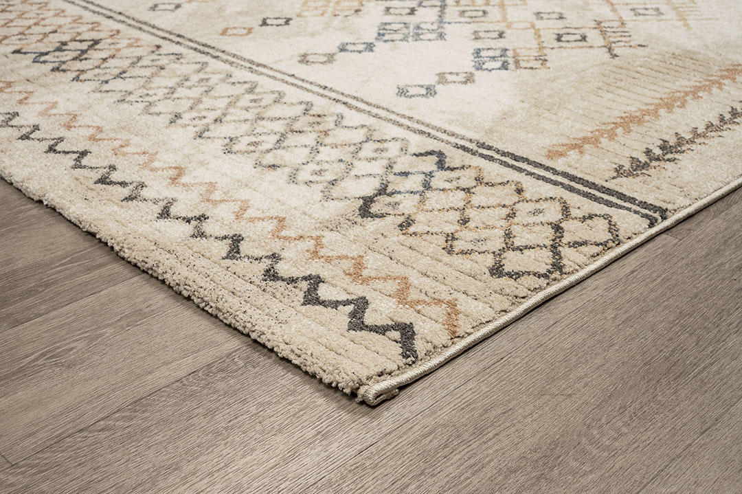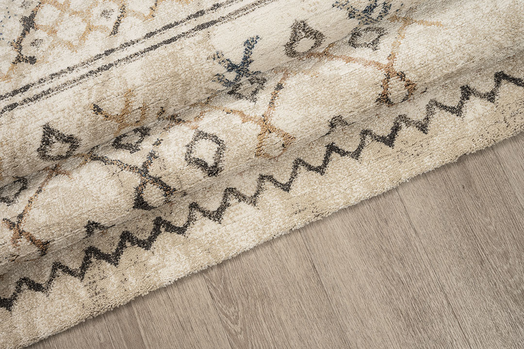 Ένα πανέμορφο με χοντρό πέλος χαλί που σε προκαλεί να ξαπλώσεις πάνω του και να το απολαύσεις! Τα προσεκτικά επιλεγμένα σχέδια τουμε την διαχρονική σικ αισθητική τηςαντίθεσης μαύρου και μπεζ αλλά και ο φρέσκος- μοναδικά αρμονικός- συνδυασμός χρωμάτων του μπεζ με παστέλ αποχρώσεις έχουν ως αποτέλεσμα την απόλυτη earth vibe ισορροπία στον χώρο που θα επιλέξετε να ντύσετε με ένα κομμάτι της συλλογής αυτής.